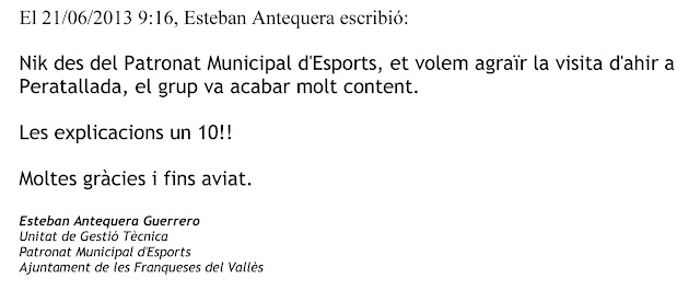 Nik des del Patronat Municipal d'Esports, et volem agraïr la visita d'ahir a Peratallada, el grup va acabar molt content.